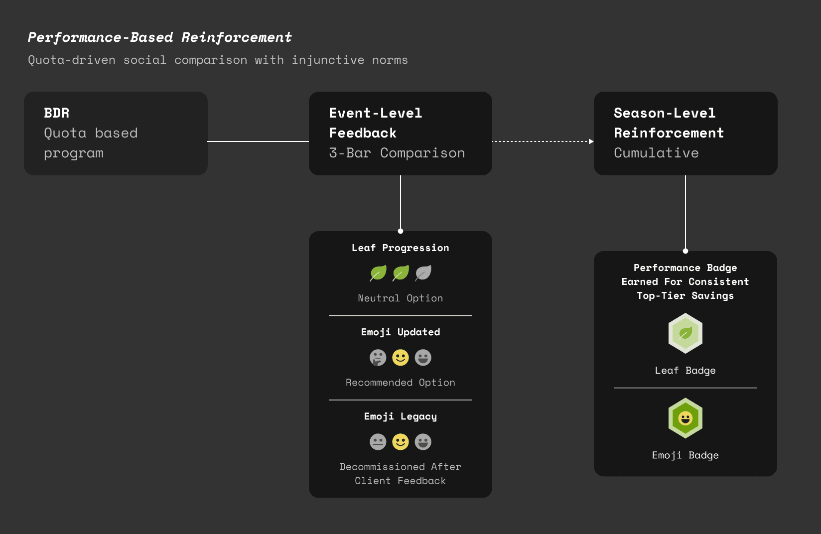 Across BDR and PTR, I designed two distinct reinforcement architectures based on program economics, client sensitivity, and behavioral science principles. While both products use comparative feedback, their motivational strategies differ intentionally.