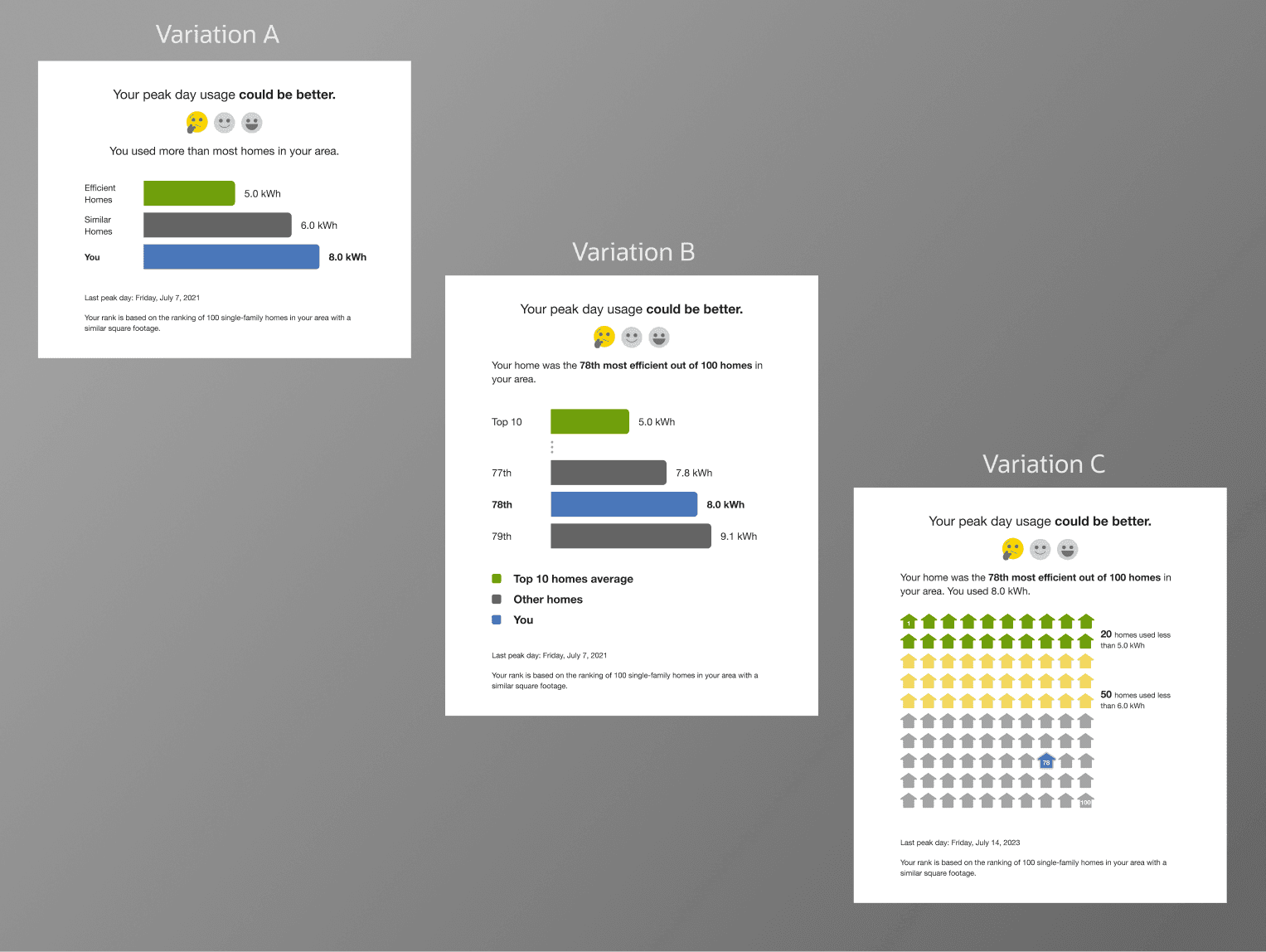 Showing energy use alongside efficient benchmarks would encourage improvement without relying on rank. This approach was inspired by the 3-bar comparison, a proven main insight already used in our most successful product line, the Home Energy Report (HER).
